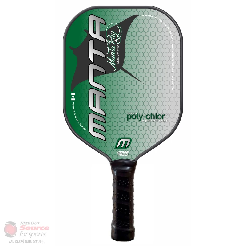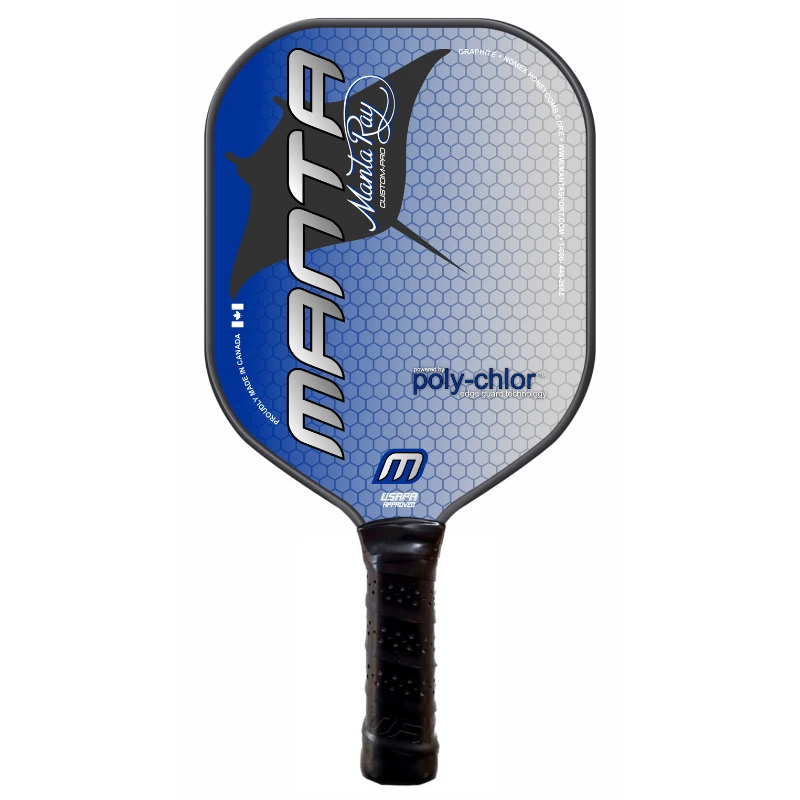 The Custom Pro Manta Ray is constructed of Aero Space Grade Graphite Skin with a Nomex Honeycomb Core. It features great power and good control. It’s wide body shape offers a larger “Sweet Spot” for maximum power and accuracy. It’s also has more playing surface than a traditional shaped paddle so you’ll never miss your shot! Backed by our poly-chlor edge-guard technology, these paddles are built to last and are great for players who are looking for a little more power and POP in their game.